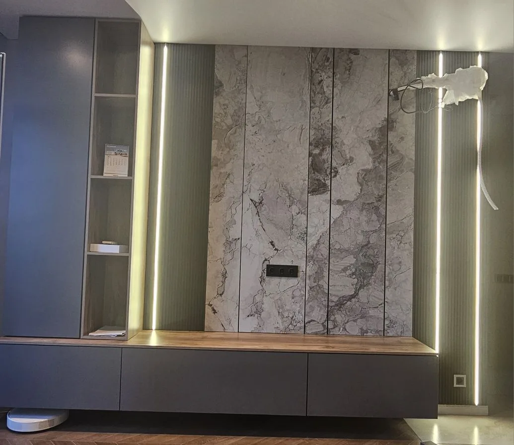 В этой гостиной мы совместили минимализм и уют, создавая пространство, где семья собирается и проводит незабываемое время